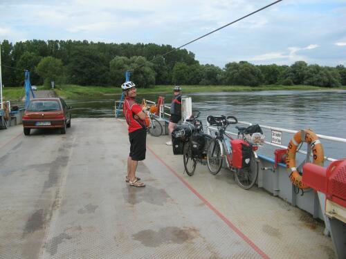 Über Vockerode und eine kleine Umleitung ging es weiter nach Dessau und Aken. Hinter Aken führte der Weg teilweise unbefestigt durch den Wald, über landwirtschaftlich genutze und durch Erntefahrzeuge und Regenfälle völlig verschlammte Straßen. Bei Breitenhagen nahmen wir die Fähre und fuhren über Walternienburg bis nach Gödnitz (118 Kilometer).