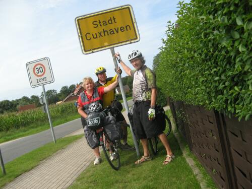 Es war nur noch Ausrollen angesagt. Von Freiburg bis zum Sperrwerk Hörne ging es 20 Kilometer immer links entlang dem Deich – Wiesenmeer, Grasmeer, Kühe, Schafe und nichts mehr – ein Ende nicht in Sicht. In der Bikline-Karte ist der Weg anders eingezeichnet. Wir haben erst kurz vor Hörne gemerkt, dass auf der Elbseite des Deiches ebenfalls ein gut fahrbarer Weg verläuft. Wir können das Osteesperrwerk überfahren und 10 Kilometer weiter sind wir schon mitten im Nordseeurlaubstrubel in Otterndorf. In Altenbruch biegt der Radweg nach links ab und führt parallel zur B73 nach Cuxhaven. Wir fahren den Bogen mit aus, da das Ziel ordentlich dokumentirt werden musste. Schließlich hatten nicht jeder beweissicher Hamburg erreicht.